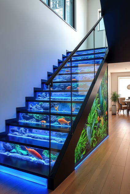 An aquarium staircase serves as a dynamic design element that can elevate the overall ambiance of a home.