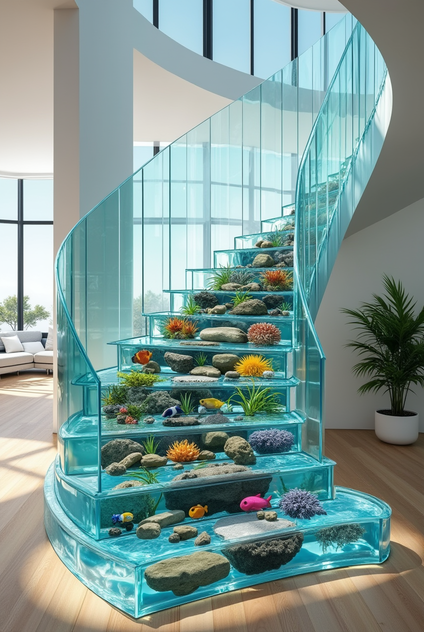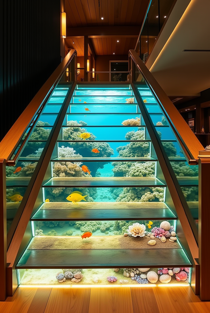 Floating Steps with Underfoot Aquariums: This modern design places aquariums beneath transparent, reinforced glass steps, giving the sensation of walking on water and providing a unique vantage point of the marine display.